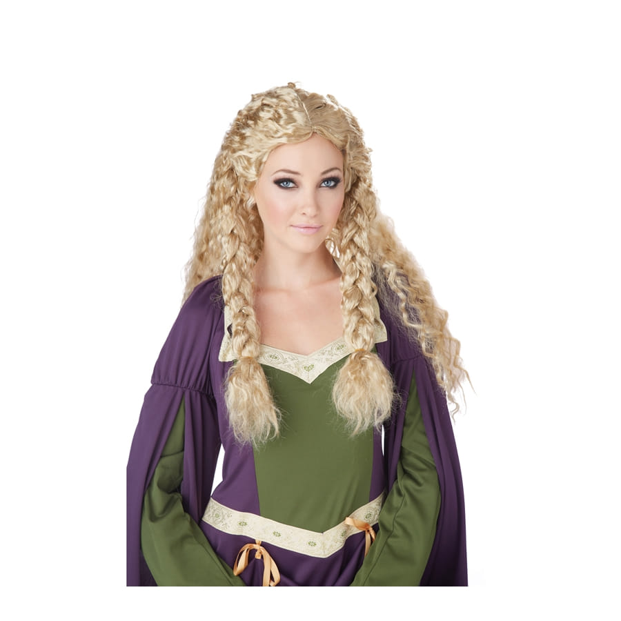 Cette perruque blonde médiévale boucles et tresses est réservée à la gente féminine. En effet, elle est de couleur blonde, longue, frisée et coiffée de deux tresses à l'avant. Vous pourrez accompagner cette sublime perruque d'un costume de princesse ou de reine médiévale, ou encore de serveuse à l'occasion d'une soirée déguisée, d'un anniversaire ou d'une fête à thème Moyen Age.