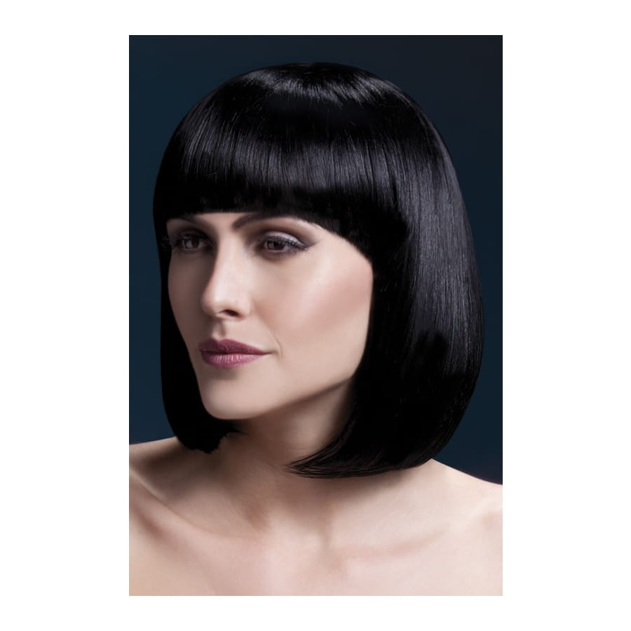 Il est fort probable que l'on vous confonde avec une star de cinéma dans cette coiffure très chic. C'est une perruque à la coupe bob, de couleur noire avec une frange qui dessine le contour du haut du visage. Il serait idéal de la porter à une soirée, avec une robe classique et élégante, afin de ressembler à une chanteuse de cabaret. Il est aussi possible de s'habiller tout en noir, et d'incarner le rôle d'une envoûtante sorcière si vous préférez. Les cheveux mesurent environs 33 centimètres de longueur (carré gonflé mi-long).