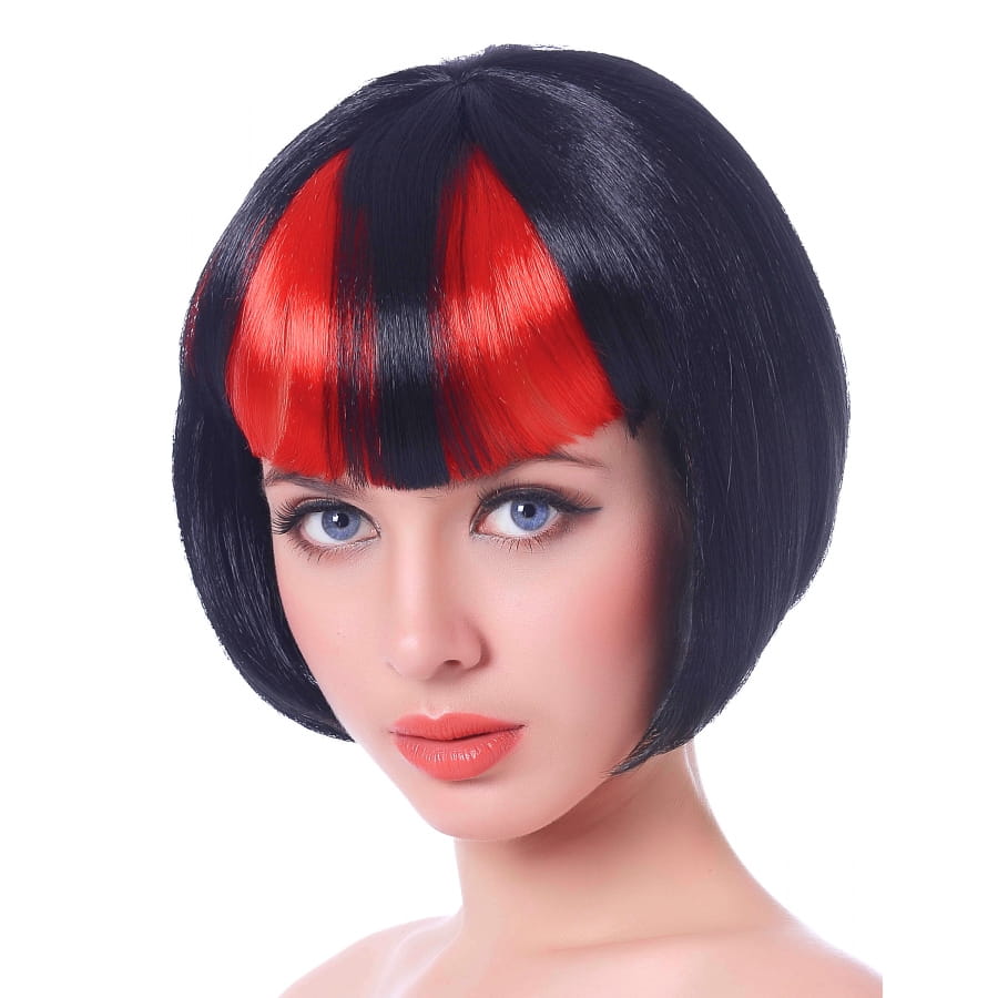 La perruque bob noire frange noire et rouge est destinée aux femmes.