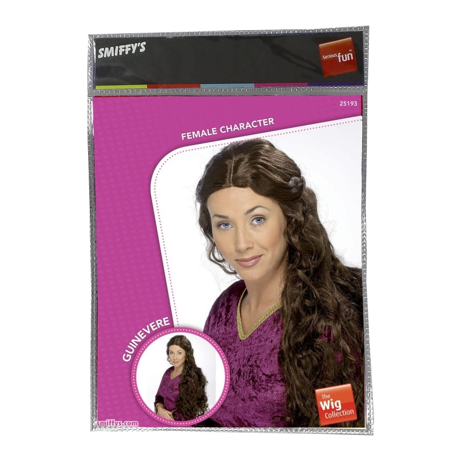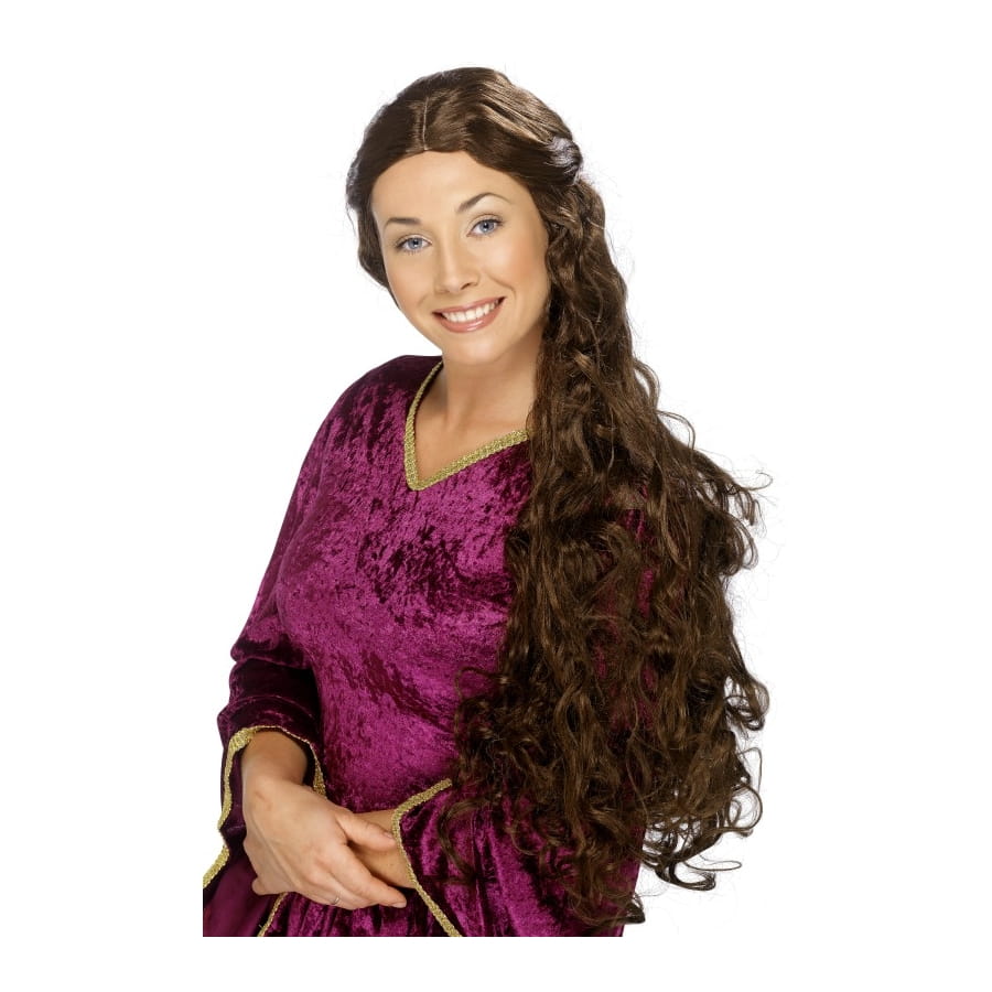 Perruque de Guenièvre de couleur brune, pour femme. Cette perruque est constituée de cheveux longs, arrivant à la taille, bouclés et coiffés à l'arrière. Elle sera idéale pour vous aider à compléter une tenue de reine ou de princesse médiévale.