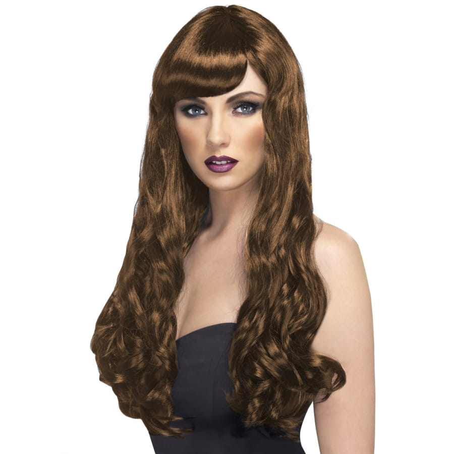 Perruque de couleur brune pour femme. Les cheveux sont très longs, arrivant à la taile, avec de jolies boucles et une frange sage. Cette perruque vous donnera une magnifique chevelure de rêve, idéale pour un look quotidien ou pour un déguisement.