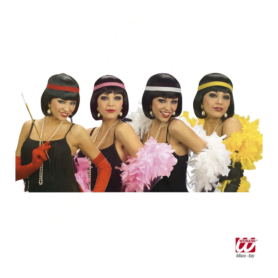 Si vous n'avez pas une de ces parfaites coiffures des femmes des années 20, cette perruque cabaret avec bandeau pailleté est indispensable pour réussir votre déguisement. Elle est en coupe carrée, de couleur noire avec un bandeau à paillettes autour, dont les couleurs disponibles sont : rouge, rose, blanche et jaune. Mais lors de la commande, vous n'aurez pas le choix de la couleur du bandeau.
