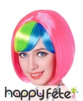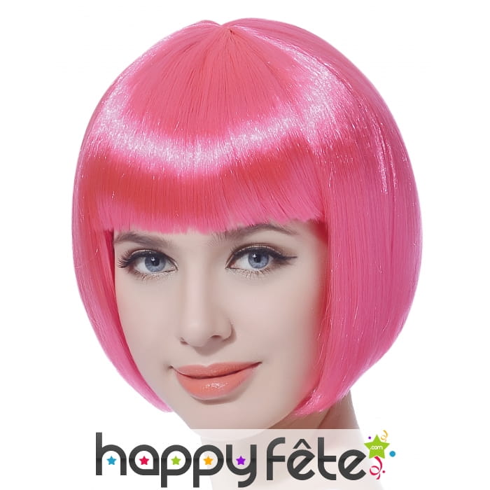 C'est une coiffe avec une frange sur le front, de couleur rose fluo présentée dans une coupe courte bombée.