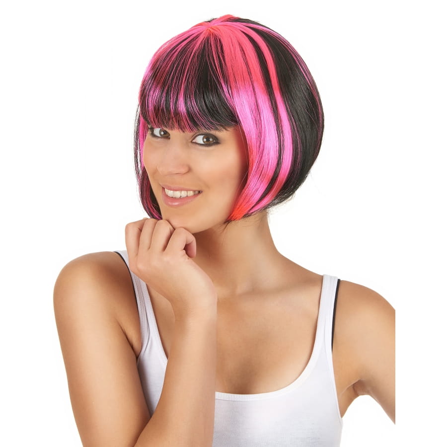 La perruque coiffée en un carré court noir agrémentée mèches roses fluo pour femme est faite de cheveux synthétiques lisses.