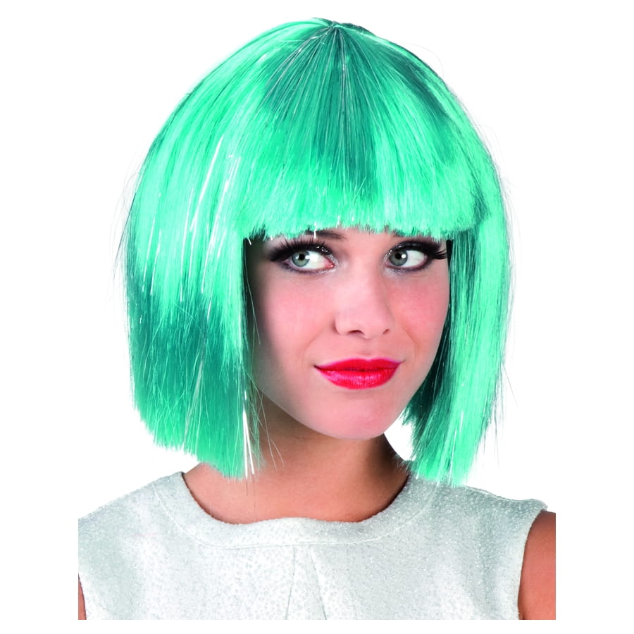 Perruque Star "Gigi", pour femme, à la coupe courte et carré et aux cheveux de couleur turquoise lamé argent. Cet accessoire est très approprié à une tenue de célébrité, de science-fiction ou de thème Bling Bling.