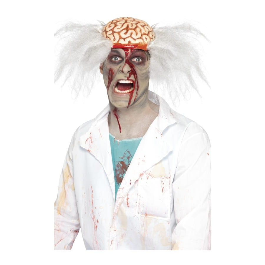 Perruque de savant fou, pour homme. La perruque est en deux parties dont une est en latex représentant le cerveau à l'air et l'autre constituée de cheveux désordonnés de couleur blanche. Ajoutez-y du faux sang et vous deviendrez un savant fou cannibale!