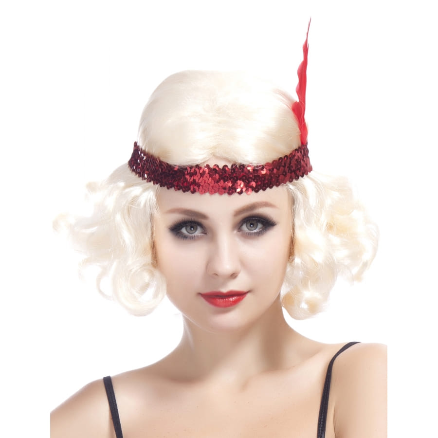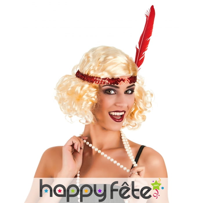 Nous vous décrivons ici la perruque charleston blonde avec bandeau rouge.
