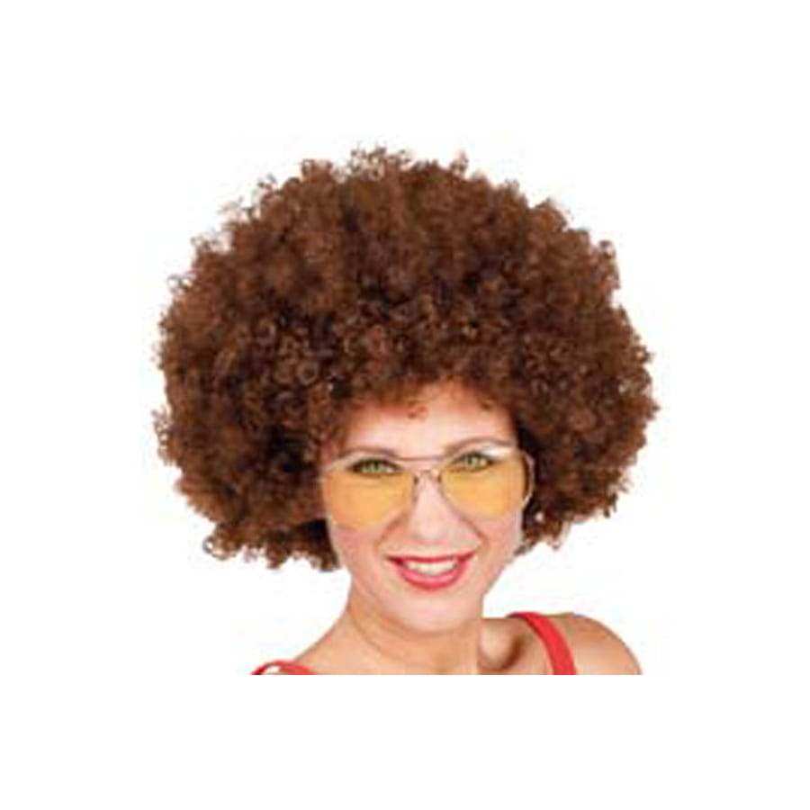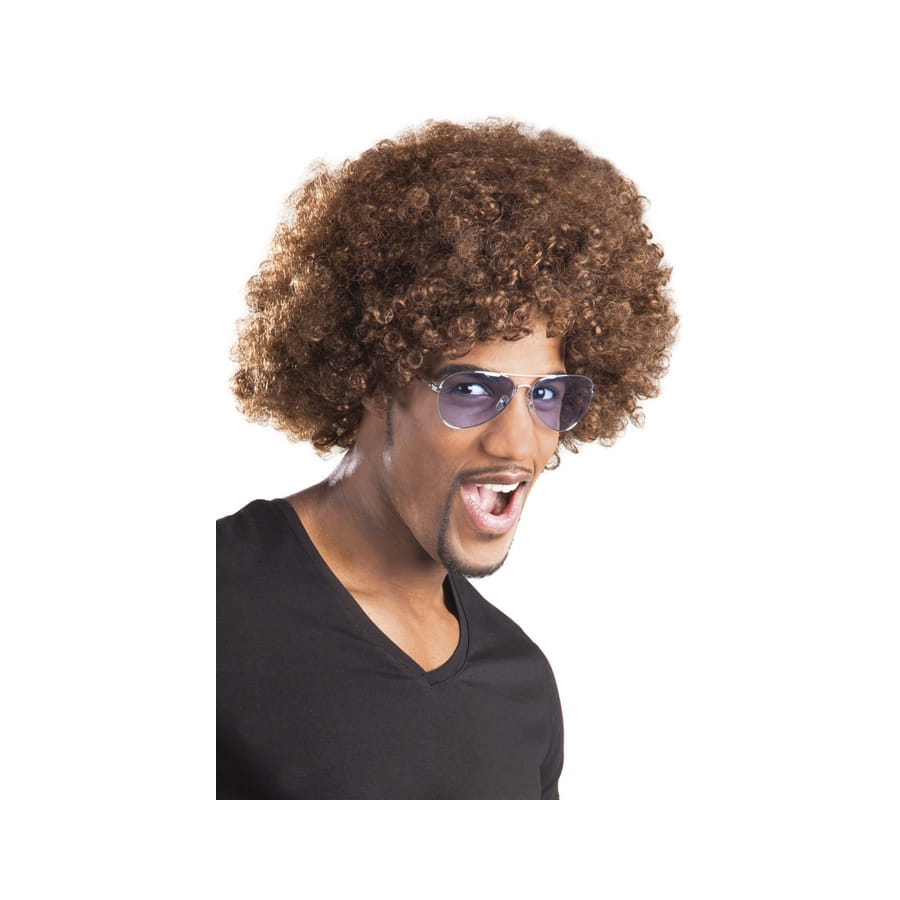 Perruque volumineuse afro frisée de couleur châtain, pour homme ou femme, équipée d'un filet élastique. Cet accessoire est parfait pour compléter un déguisement de danseur disco.
