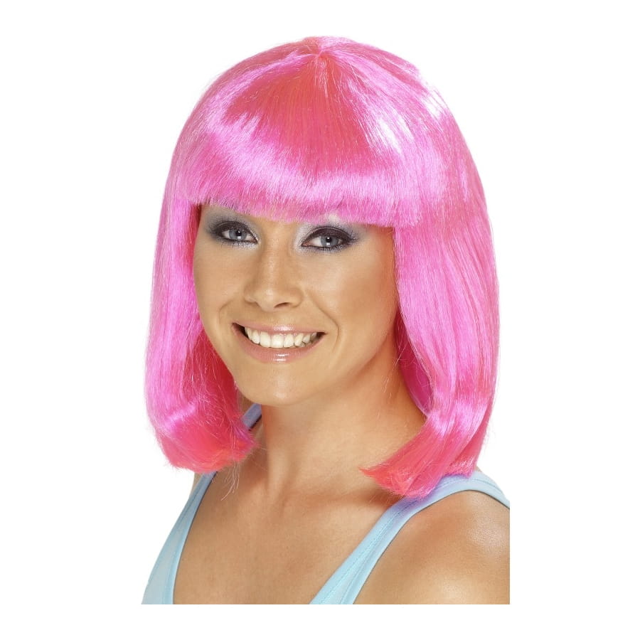 Perruque de cheerleader de couleur rose, pour femme. Les cheveux sont coupés courts et carrés avec une frange assortie. Avec sa couleur flashy, vous êtes sûre de ne pas passer inaperçue, même déguisée.