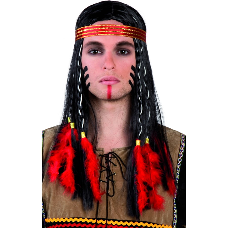 Perruque d'Indien d'Amérique de la tribu Cheyenne avec bandeau et plumes, pour homme ou adolescent. Les cheveux sont noirs, les plumes et le bandeau sont rouges. Portez cette perruque pour vous déguiser en parfait Indien traditionnel.