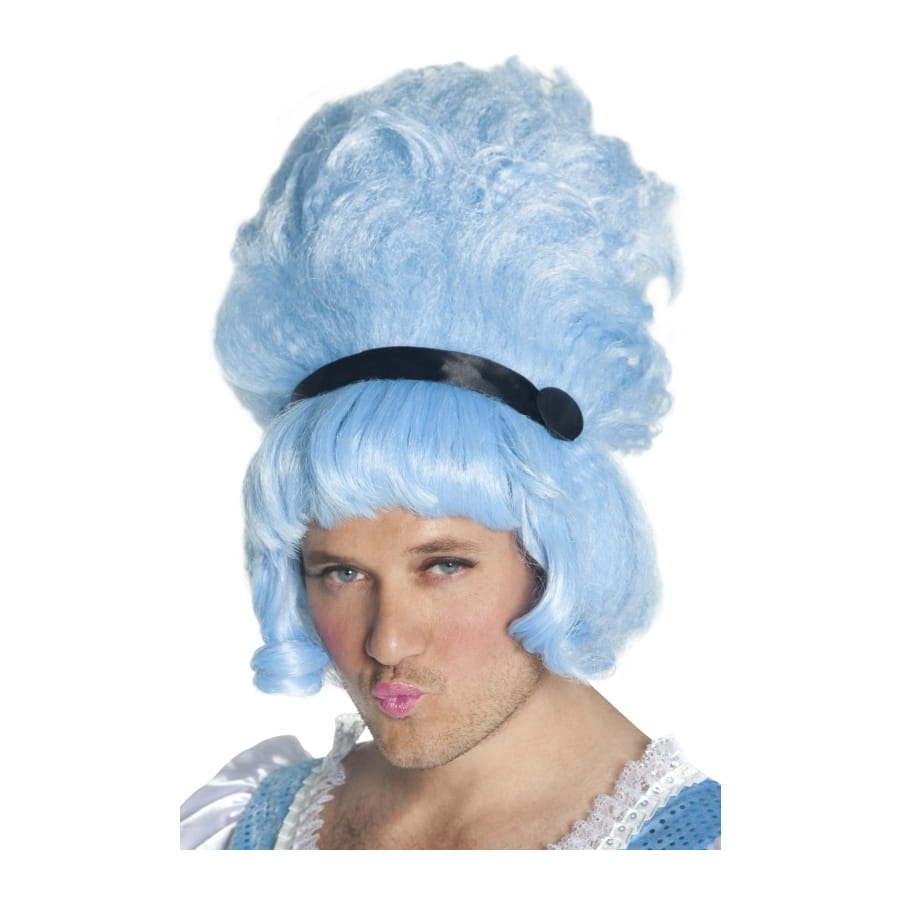 Perruque de Cinderfella de couleur bleu pastel, pour homme ou femme. Les cheveux sont coiffés en volumineux chignon médiéval, avec un ruban noir et une épaisse frange. Pas exactement destinée à vous rendre beau ou belle, cette perruque vous donnera surtout un look un comique.