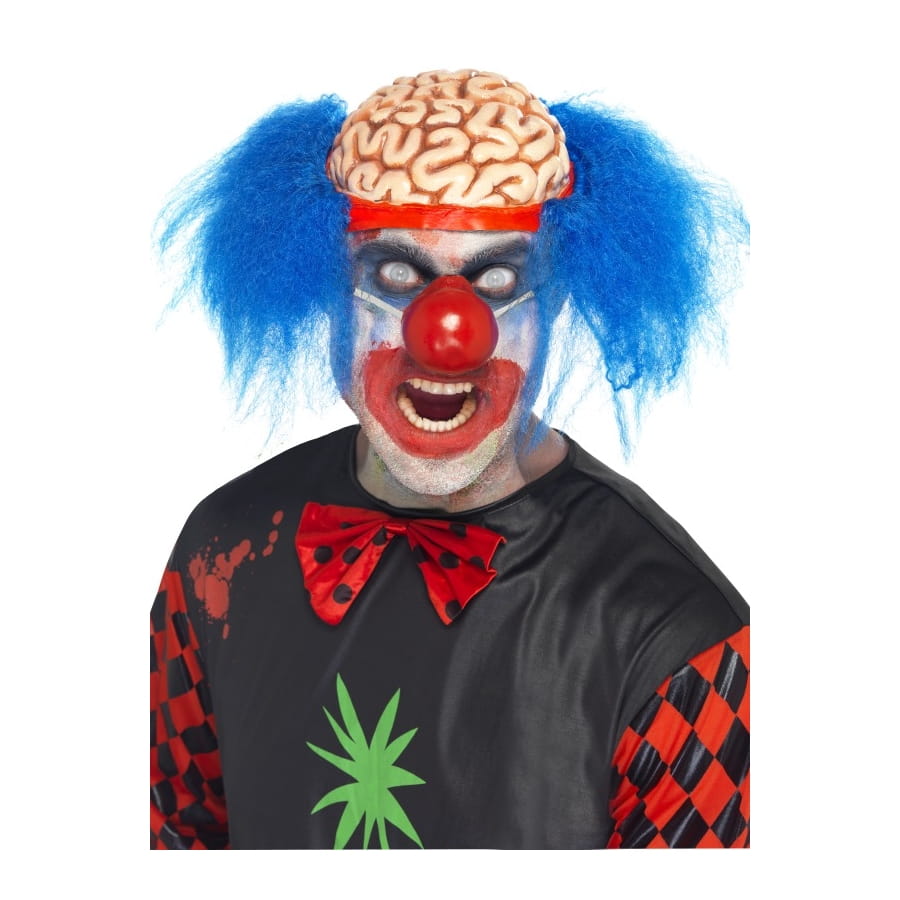 Perruque de clown scalpé pour homme. Cet accessoire comporte des cheveux ébouriffés de couleur bleu et une demi-cervelle en plastique. De quoi horrifier plus d'un à l'occasion d'Halloween!