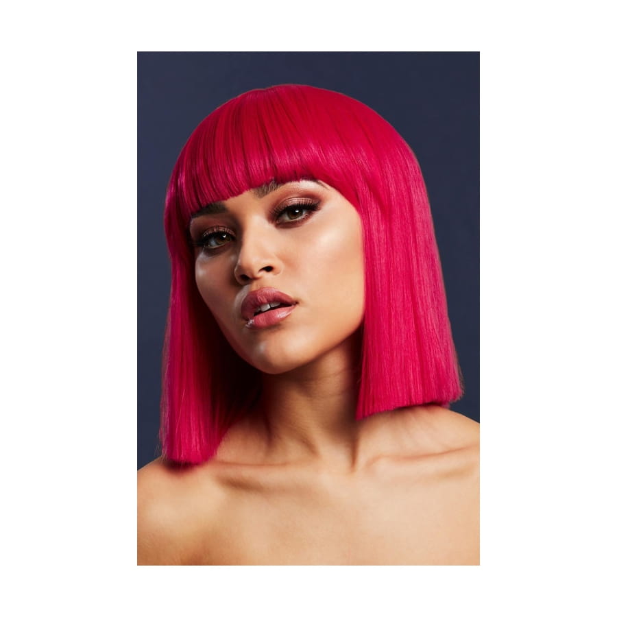 Elle présente une coupe carrée faite de cheveux rose foncé.