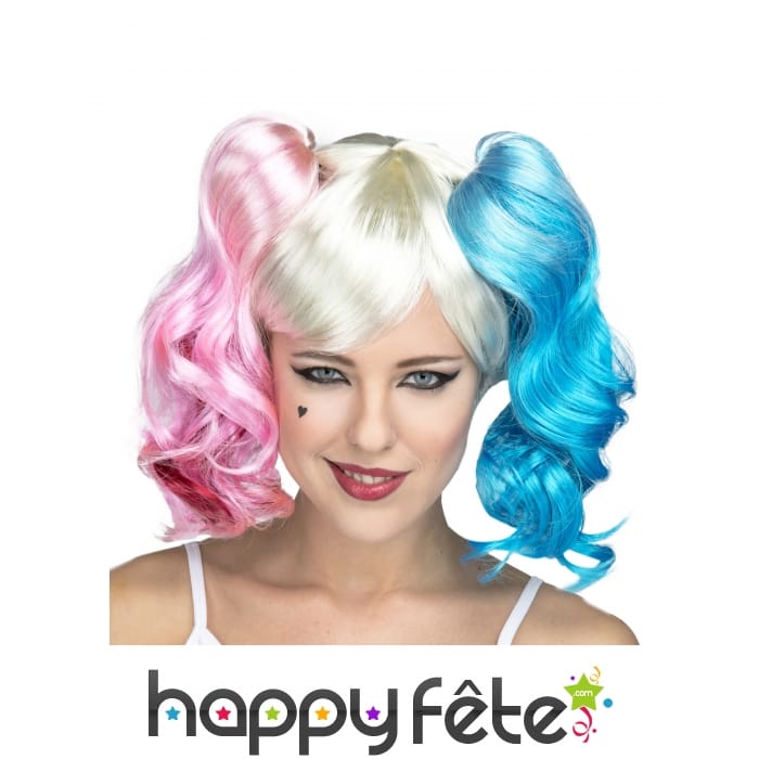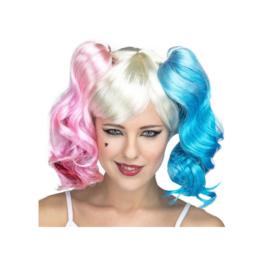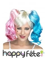 Faites ressortir votre coté décalé avec la perruque Incarnez une super-vilaine avec d'arlequin rose et bleu pour femme.