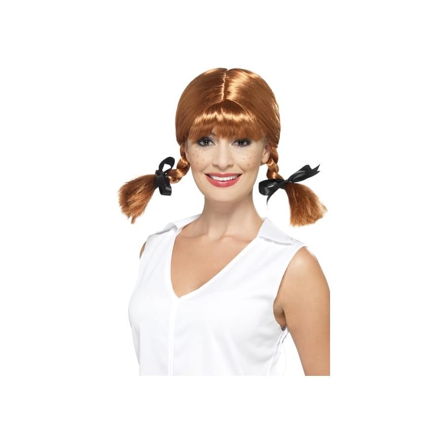 Pour votre costume de petite écolière modèle, nous vous proposons cette perruque d'écolière munie de deux tresses attachées avec des rubans de couleur noire, exactement comme la coiffure que ces jeunes filles portent si souvent. Cette perruque est de couleur châtain et est proposée uniquement pour vous Mesdames. Vous aurez de quoi parfaire votre déguisement maintenant!
