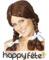 Elle possède une grande frange sur le devant et se termine par 2 tresses d'écolière décorées de 2 rubans rouge satiné.