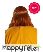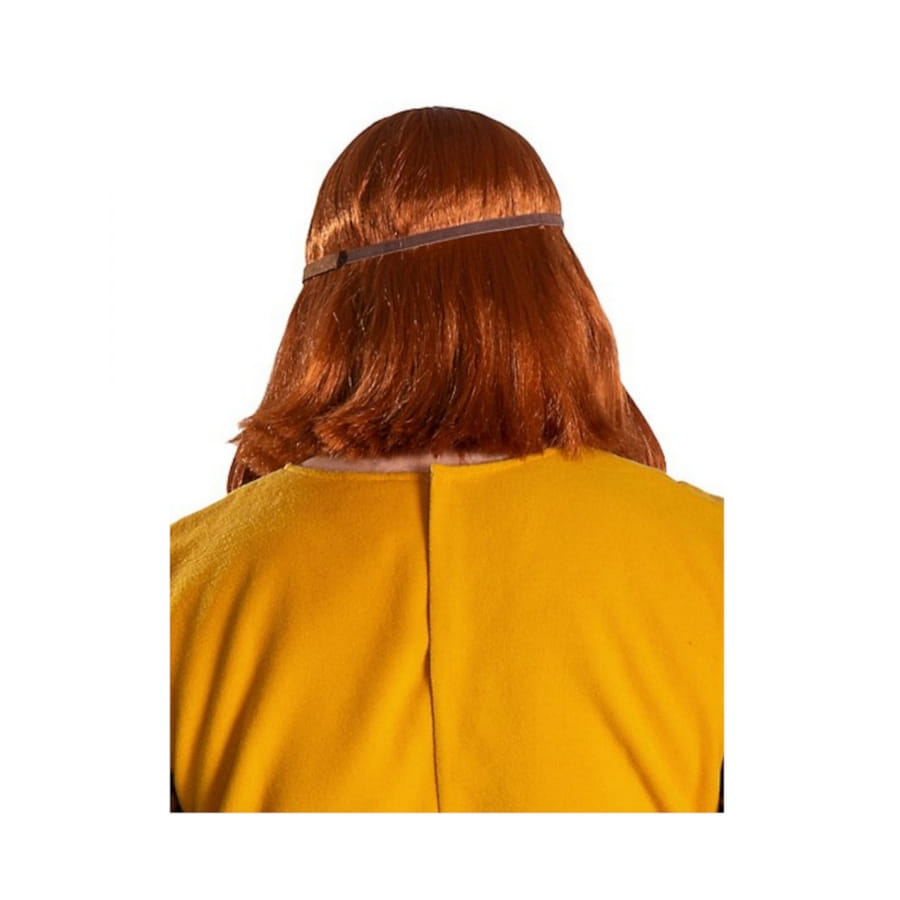 La perruque est faite de cheveux synthétiques lisses et mi-longs, avec une frange qui recouvre le front.