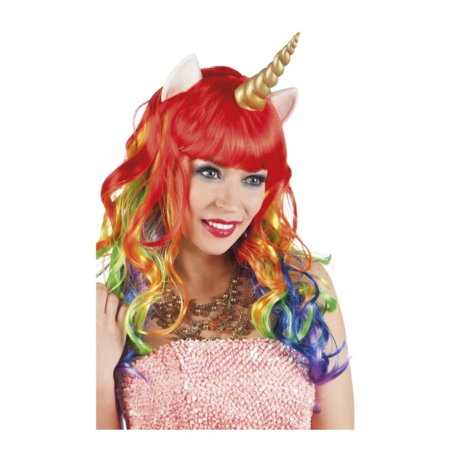 Votre déguisement de licorne sera parfait avec cette perruque surmontée d'oreilles et d'une corne. La perruque a été faite de couleurs vives et affiche de jolies boucles. Les oreilles et la corne l'ornant sont en latex. Avec un maquillage assez coloré, vous aurez l'air de quelqu'un sortant d'un conte de fée, Mesdames.