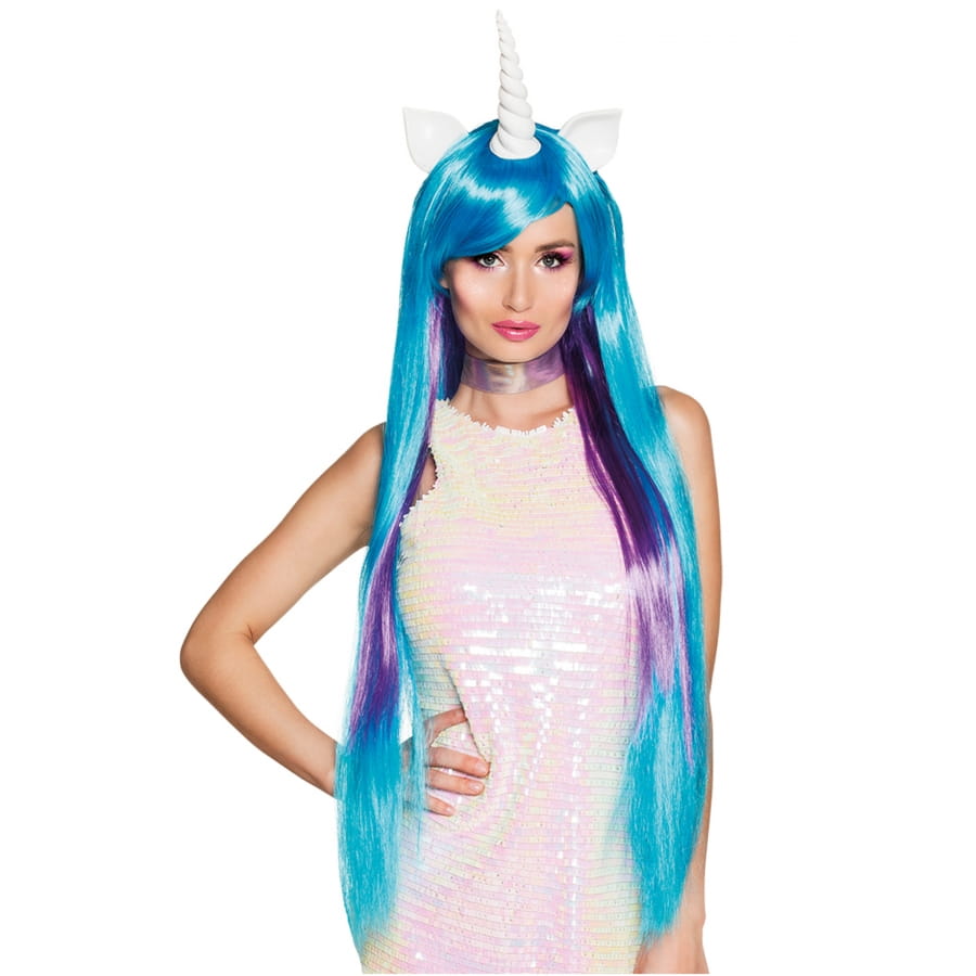 La perruque avec frange est surmontée de 2 oreilles et d'une corne de licorne.