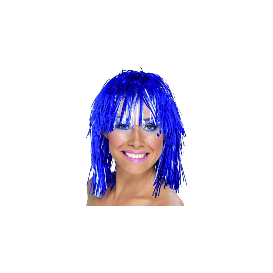 Perruque métal gaufrée à coupe courte de couleur bleu électrique pour femme. Cette perruque est striée de jolies mèches blanches pour créer un effet reflet de mèches. Vous pourrez vous en servir pour compléter un déguisement disco ou pour ajouter une touche flashy à vos habits.