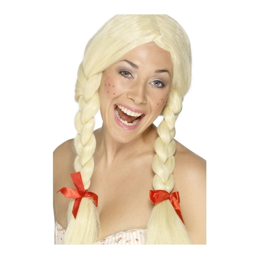 Perruque d'écolière blonde, avec deux tresses retenues par des noeuds rouges, pour femme ou adolescente. Tenez cet accessoire hors de portée du feu. Vous pouvez utiliser cette perruque pour vous déguiser en écolière en ou Bavaroise.