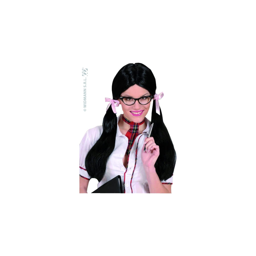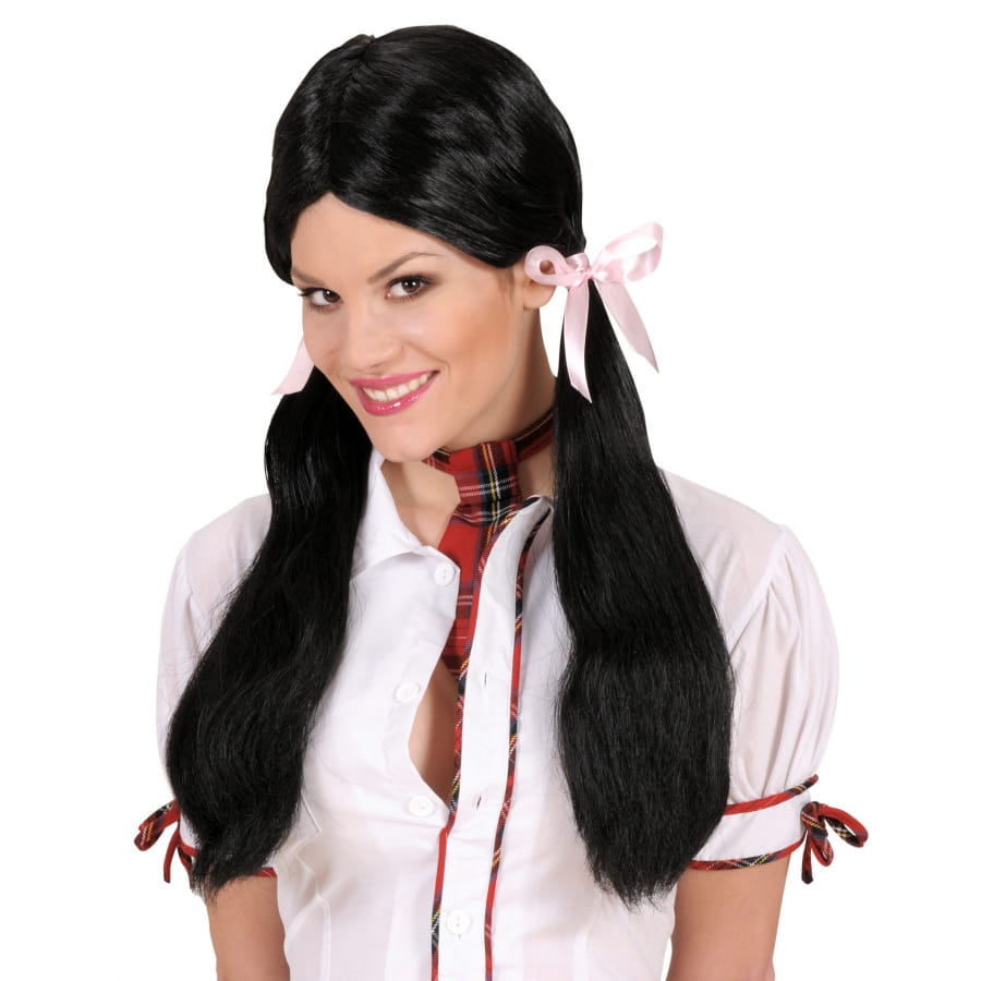 Perruque d'écolière coquine de couleur noire, pour femme, composée de longs cheveux lisses et coiffées en deux couettes retenues par des rubans. Avec cet accessoire sexy, vous ferez tourner les têtes lors d'un enterrement de vie de garçon ou de jeune fille!