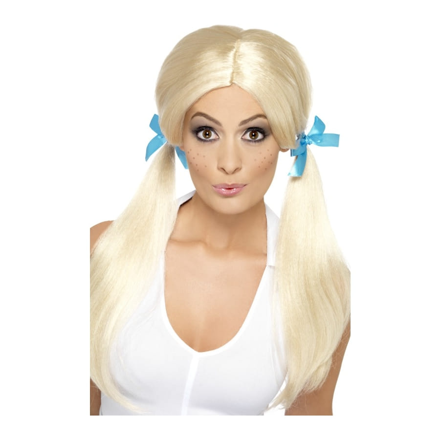 Perruque d'écolière de couleur blonde pour femme. La perruque est coiffée en deux couettes sages nouées par des rubans bleue. Vous pouvez vous déguiser en gentille écolière toute sage ou en écolière sexy.