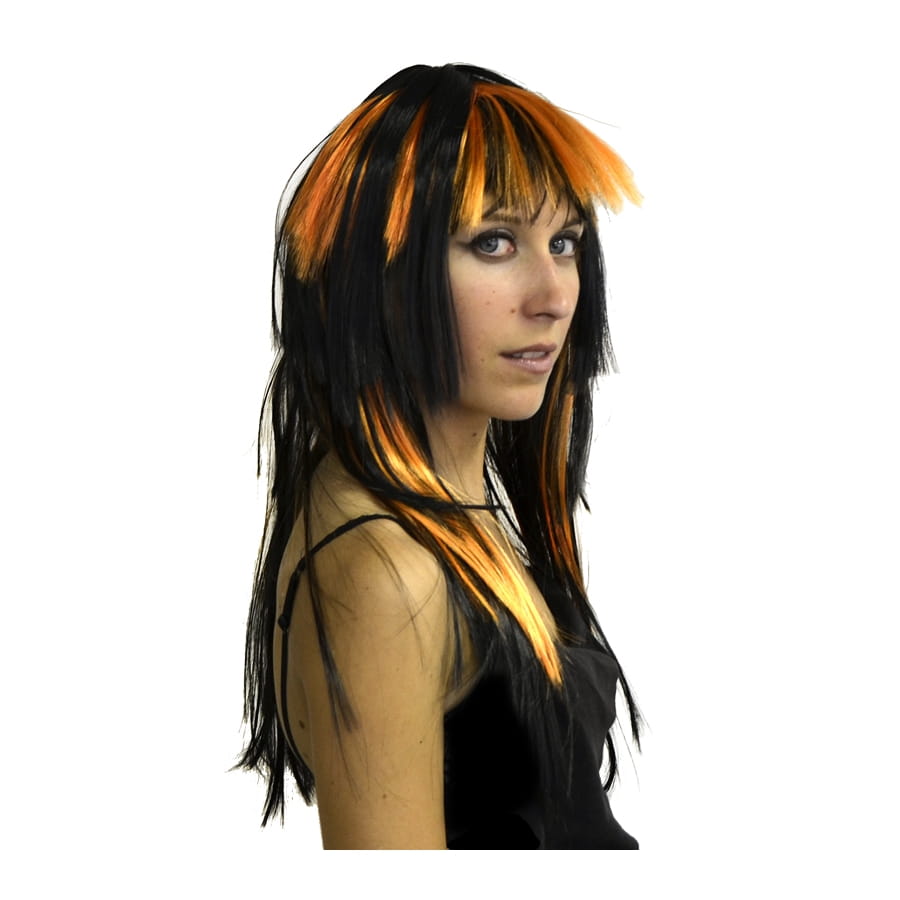 Offrez-vous une chevelure enflammée style Punk pour Halloween avec cette superbe perruque de couleur noire avec des mèches de couleur orange. Elle pèse 120 grammes est coporte une petite frange. Elle peut être utilisée pour un style punk, de sorcière ou pour un style Rock'n Roll.