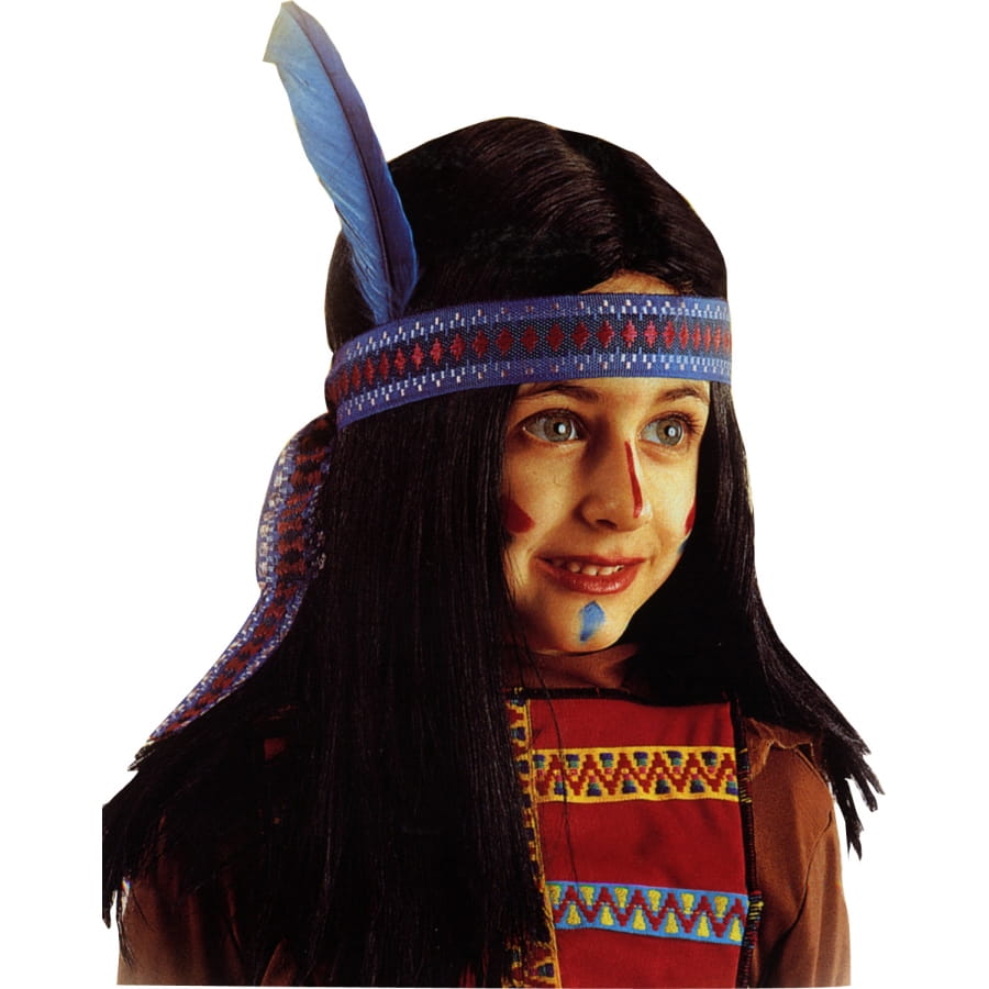 Pour qu'il ressemble a un Indien pour le carnaval , il aura besoin de cette perruque. Cette perruque cheveux long, elle est noire avec un bandeau rouge, bleu et blanc avec une plume de couleur bleu sur le coté. Il pourra aussi le porter pour un gouter d'anniversaire à thème.