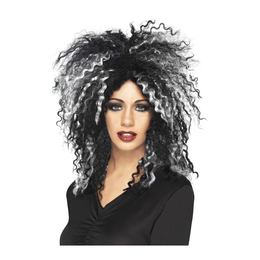 Perruque de femme diabolique de couleur blanche et noire, pour femme ou adolescente. La perruque est faite de cheveux frisés et volumineux avec une multitude de mèches blanches. Elle sera idéale pour un déguisement de sorcière à l'occasion d'Halloween.