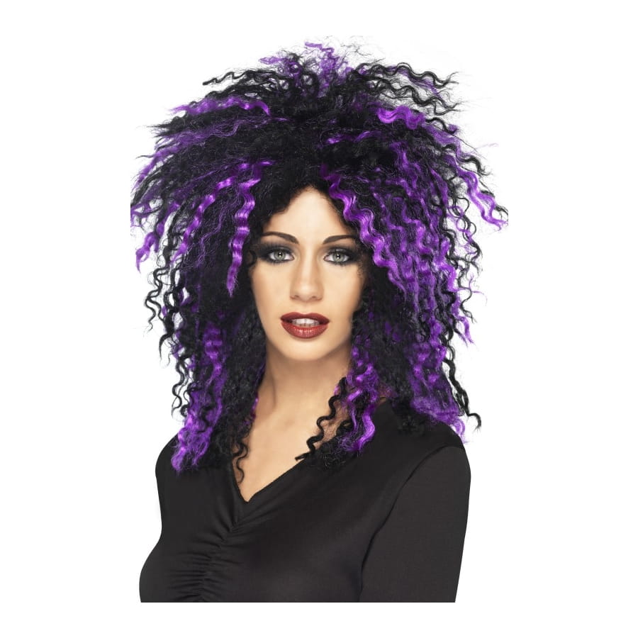 Perruque de couleur noire et violette, pour femme. Les cheveux sont mi-longs, arrivant aux épaules, frisés et volumineux. Ils sont principalement noirs avec une multitude de mèches violettes. Cette perruque vous donnera un air diabolique, idéal pour un déguisement de diablesse ou de sorcière.