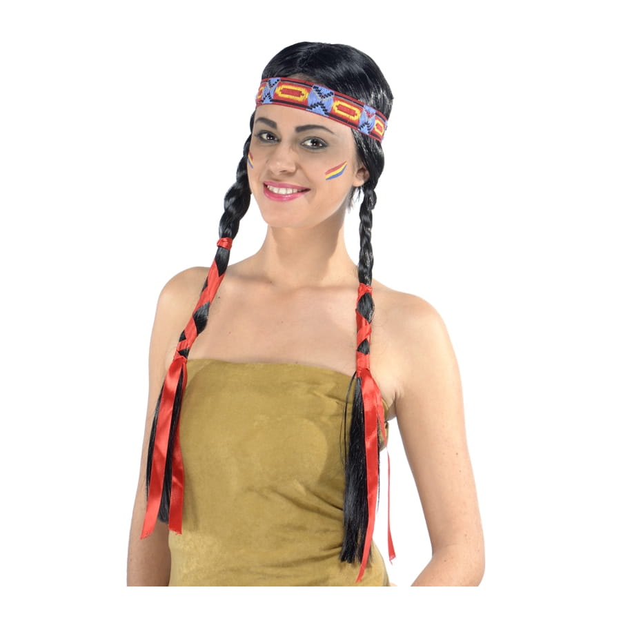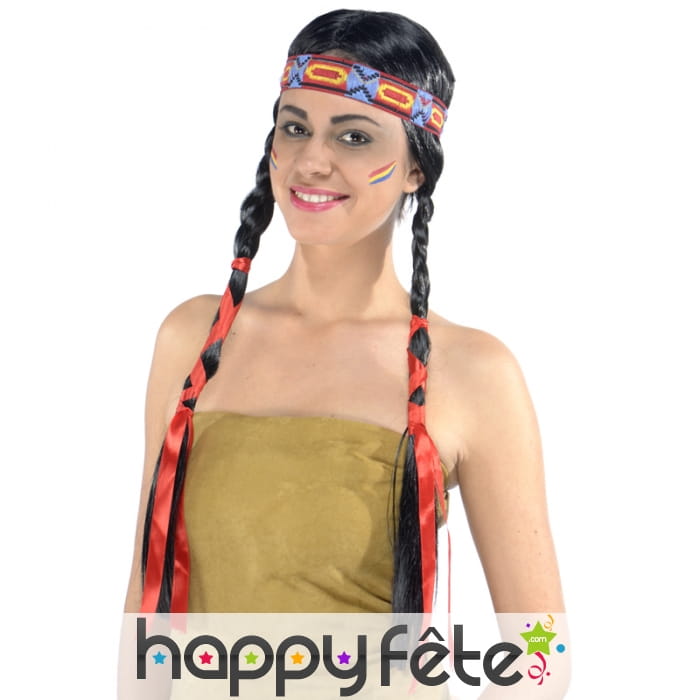 Si vous n'avez pas une très longue chevelure noire et toute lisse, vous aurez besoin de cette perruque femme indienne avec double tresses pour parfaire votre déguisement d'indienne. Vous aurez l'air innocent d'une Indienne avec ces deux longues tresses. Il y a également dans le lot un bandeau multicolore, qui n'est pas fixé à la perruque, et une plume