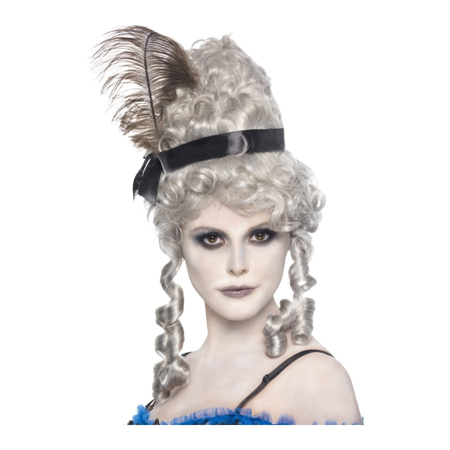 Cette perruque de couleur grise possède une multitude d'usages. Elle peut vous servir pour un déguisement de fille de saloon fantôme ou pour tout autre déguisement basé sur un thème d'Amérique ou d'horreur. La perruque est bouclée, arrangée de façon sophistiquée mais donnant tout de même un air morbide.