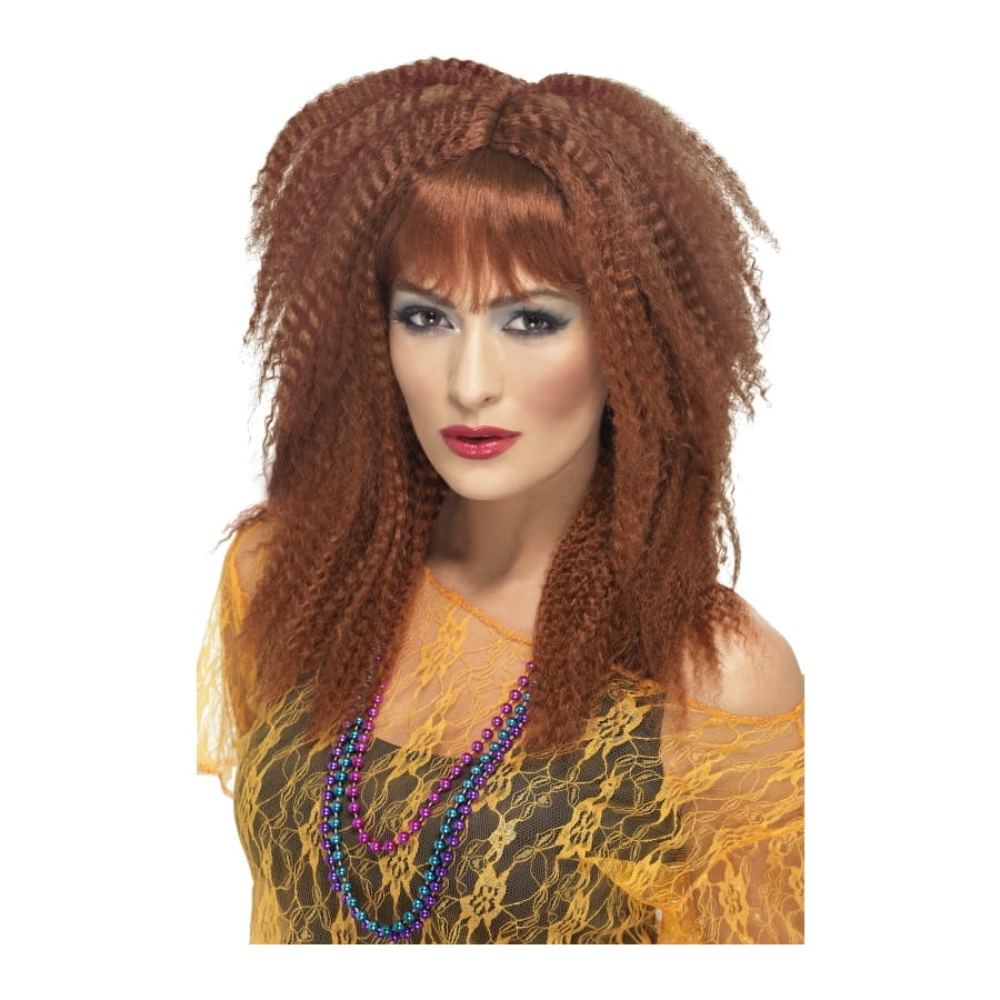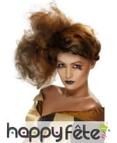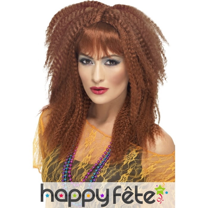 Perruque frisée de couleur brune, avec frange droite, pour femme ou adolescente. La perruque est volumineuse, avec des cheveux mi-longs. Elle est parfaite pour un carnaval, pour un style punk ou pour un enterrement de vie de garçon ou de jeune fille.