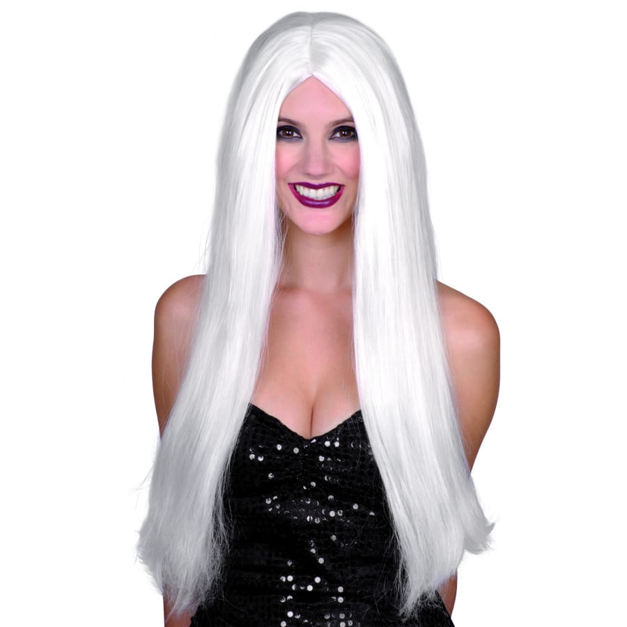 Perruque ignifugée aux longs cheveux lisses. Cet accessoire pour femme est de couleur blanche. Vous la trouverez particulièrement adaptée à un déguisement d'Halloween tel que sorcière ou ange.
