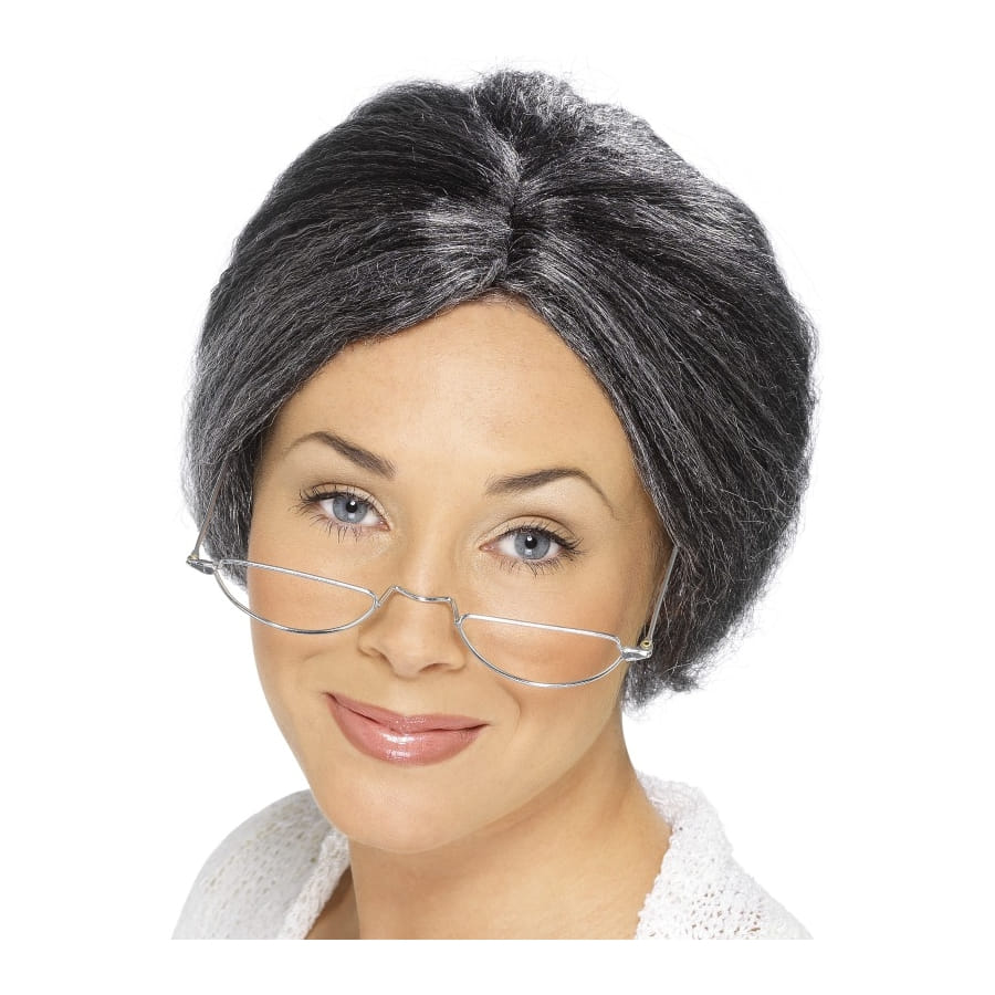 Perruque de grand-mère de couleur grise et noire pour femme. Les cheveux sont coiffés en un chignon sage sur la nuque. Associez cet accessoire à des lunettes pour vous transformer en vraie grand-mère.