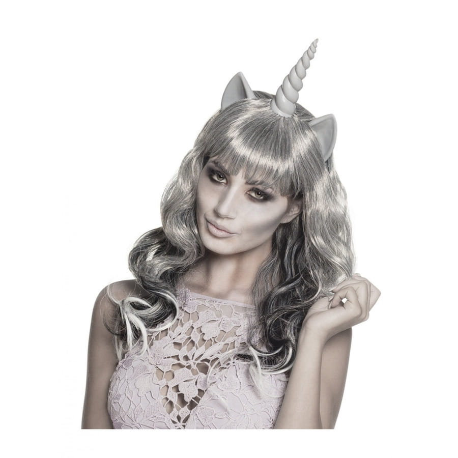 Transformez-vous en un animal de conte de fées, en arborant cette perruque grise de licorne avec corne pour adulte.