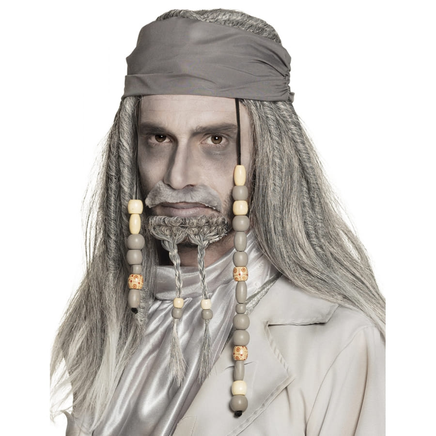 La perruque grise de pirate agrémentée de perles et d'un bandana est destinée aux hommes.
