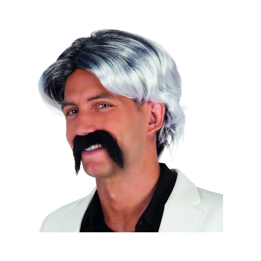 La perruque se pare des couleurs rayonnantes de la lune, sous un mariage de gris et de blanc parfaitement réussi, si la moustache adhésive est noire.