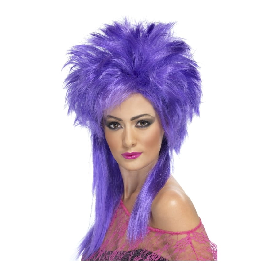 Perruque groovy de couleur violette pour femme. Cet accessoire excentrique et singulier est composé d'une touffe de cheveux sur le haut et de quelques mèches sur le bas. Cette perruque vous donnera un air punk ou celui de diva déjantée selon les accessoires que vous y associerez.