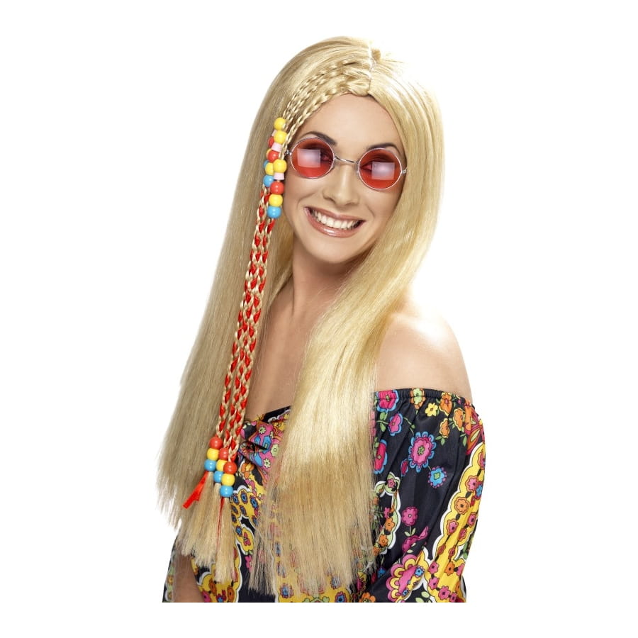 Perruque de hippie, pour femme ou adolescente, de couleur blonde avec tresses et perles multicolores. Ajoutez-y une paire de lunettes rondes pour compléter un déguisement de hippie pour une soirée musicale ou pour une fête basée sur le thème des années 50-60.