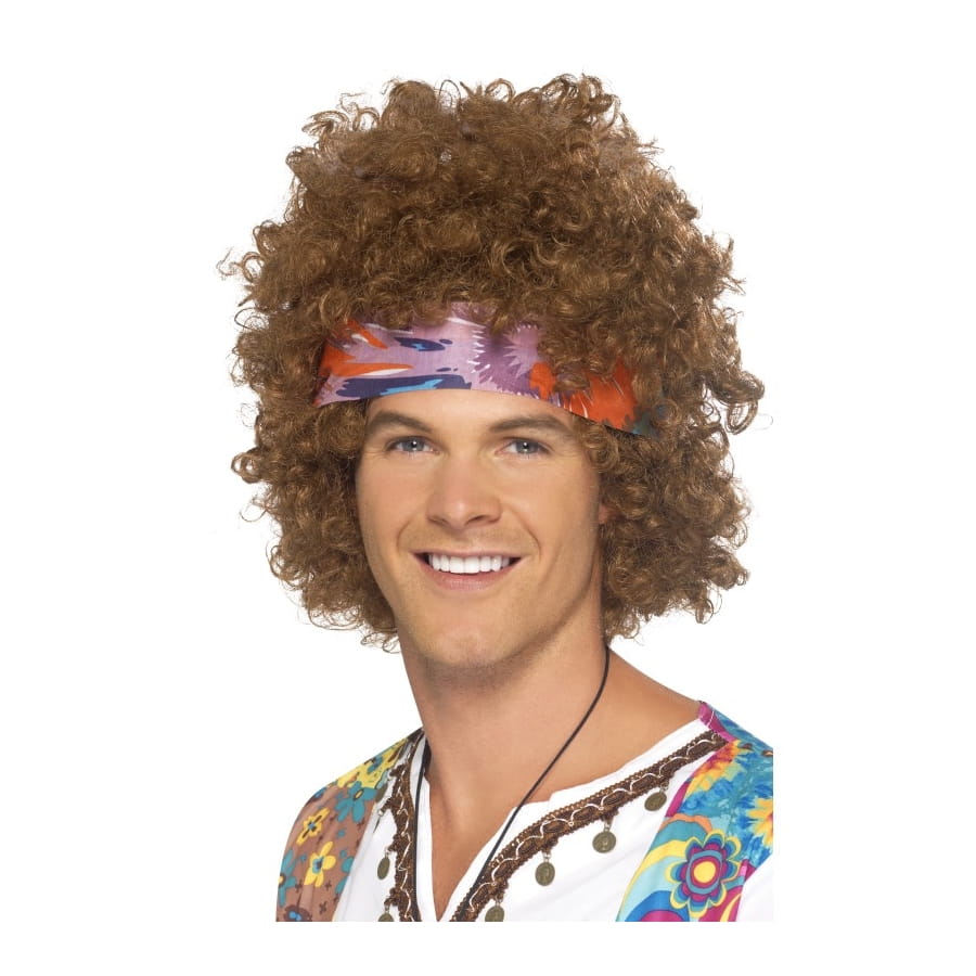 Cette coupe de cheveux afro avec bandeau était très courante chez les hommes pendant les années 60. Même Jimi Hendrix l'a adopté pendant un moment. Cette perruque, elle, est de couleur brune avec un bandeau de différentes couleurs vives, avec dominance du violet et de l'orange. Elle est idéale pour une fête sur le thème hippie! N’oubliez pas de bien choisir un costume avec de belles couleurs vives également !