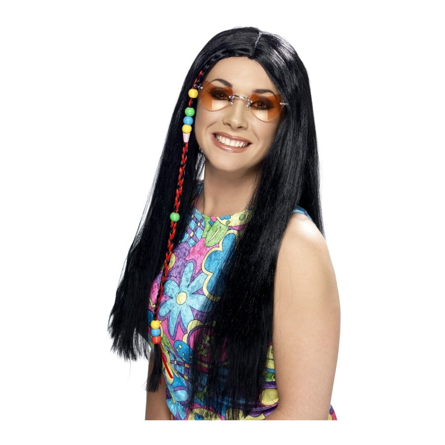 Longue perruque de hippie, pour femme ou adolescente, de couleur noire. Cet accessoire comporte une tresse multicolore. Enfilez cette perruque pour une soirée hippie ou basée sur le thème des années 50-60.