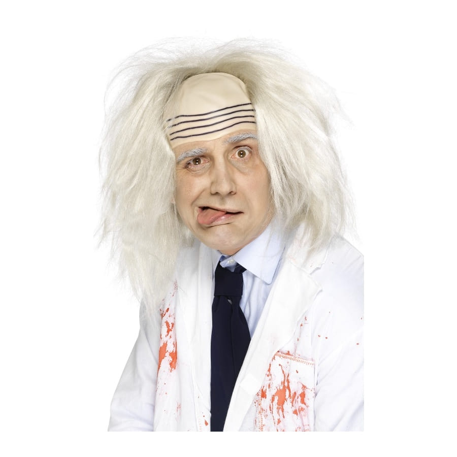 Perruque de savant fou pour homme. Cet accessoire est constitué d'un faux crâne chauve duquel sortent des cheveux blancs épais et désordonnés. Vous pourrez bien évidemment utiliser cette perruque pour un déguisement d'homme fou pour Halloween.