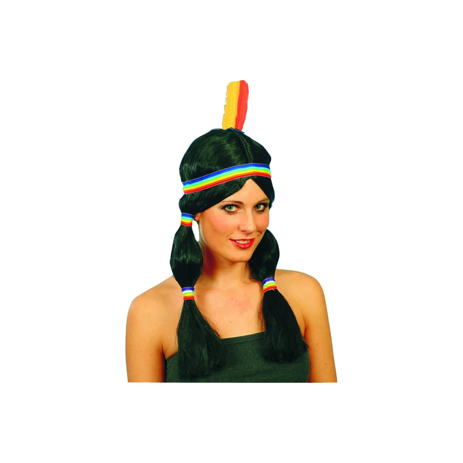 Pour incarner la femme du chef du tribu indien, grâce a cet accessoire vous serez la parfaite Indienne. De couleur noir, cette perruque indienne avec deux longues nattes est composée d'un bandeau de couleur vive ainsi qu'une plume.