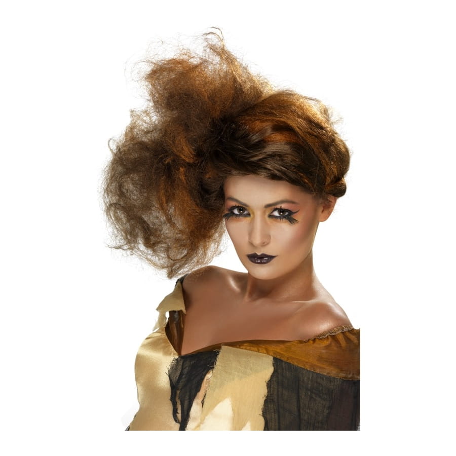 Pour vous métamorphosez complètement pour Halloween vous pourrez vous en servir de cette perruque. Les cheveux sont châtain, ils sont attaché sur le coté avec un effet décoiffé assez volumineux avec des reflets dans.