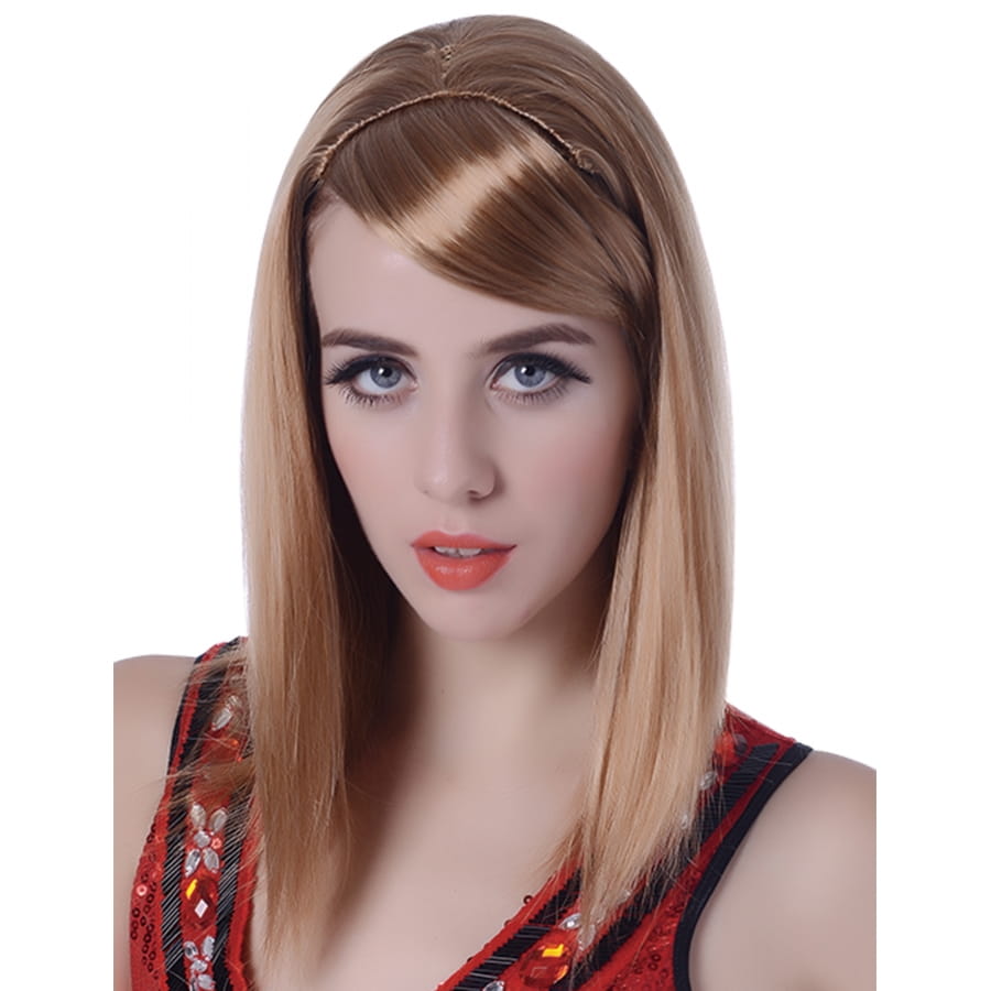 La perruque lisse blonde mèches caramel, mi longue pour femme est constituée de cheveux synthétiques.