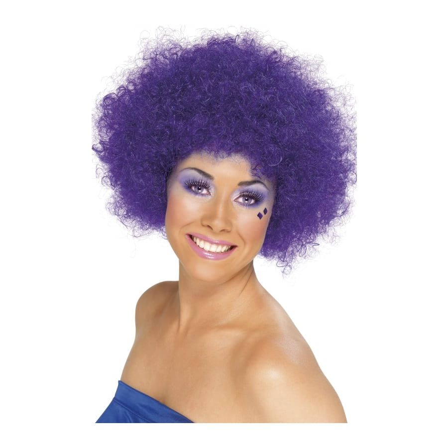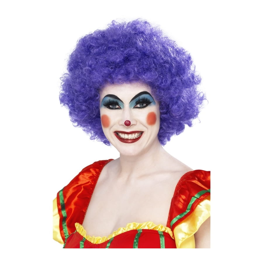 Perruque de clown de couleur mauve pour femme. Les cheveux sont frisés et volumineux et la couleur la rend idéale pour un déguisement flashy disco ou de clown.