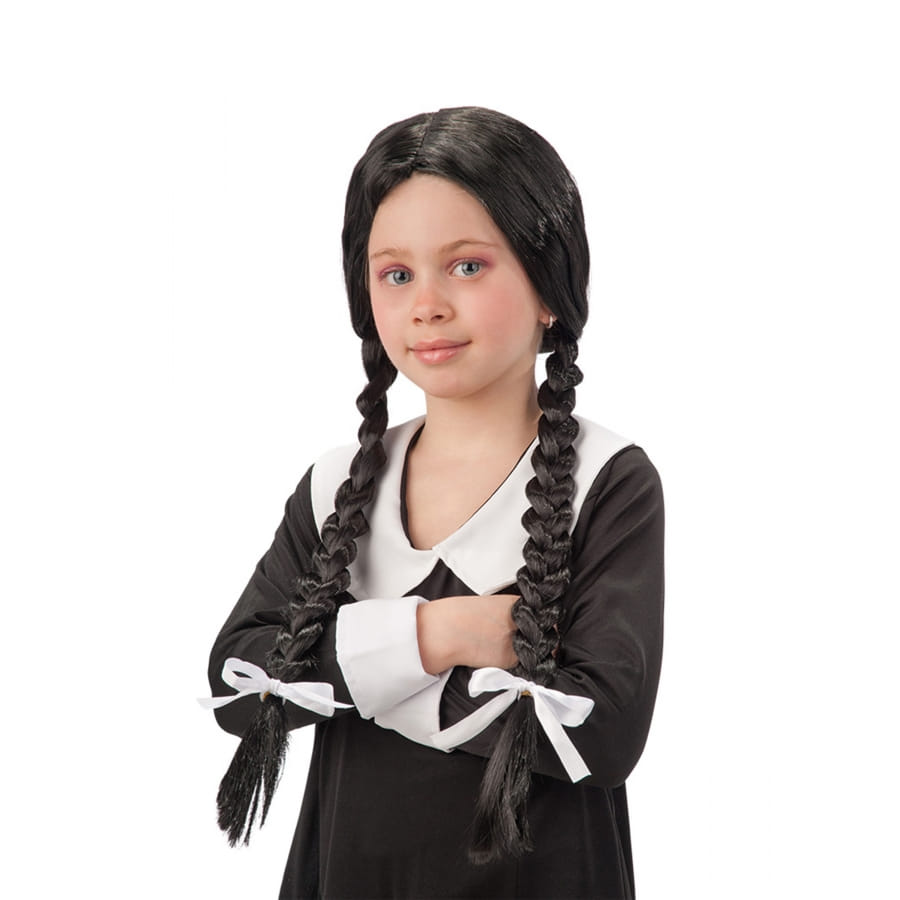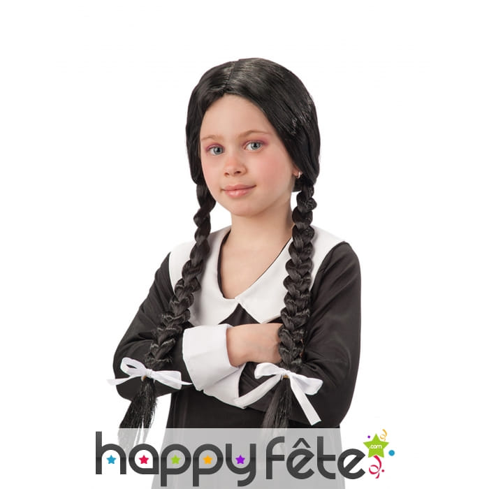 La perruque de Mercredi Addams pour enfant est constituée de cheveux synthétiques.