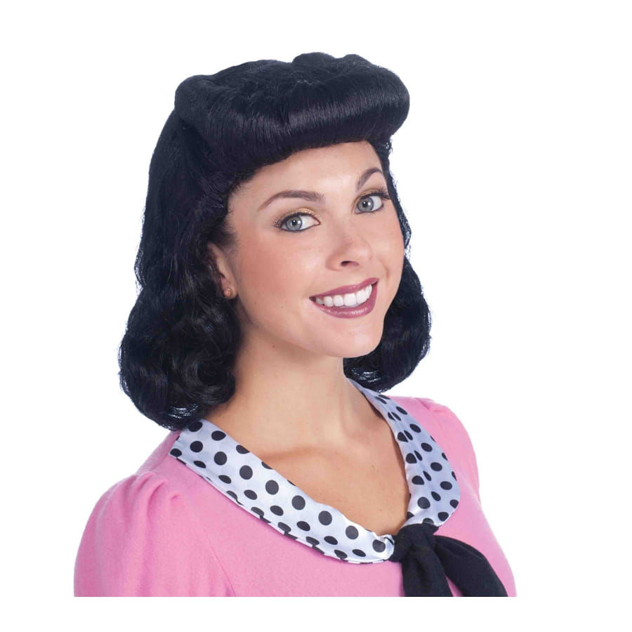 Cette perruque mi-longue ondulée noire, années 50 a des cheveux un peu ondulés avec une partie enroulée au-dessus de la tête. Cette perruque est de couleur noire, conçue pour femme. Elle sublimera votre déguisement rétro de la plus belle des manières et conviendra à de nombreuses occasions : bal costumé, soirée à thème, carnaval...